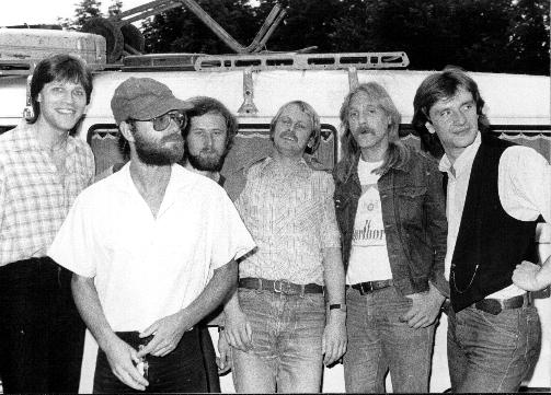 die Gitarrenband - Westcoast-Music vom Feinsten v.l.n.r.: Bernd Stasko (drums), Heiner Lürig (git), Dieter Dorow (voc, perc) Jürgen Kabus (b), Manfred Kraski (git), Dirk Erdmann † (voc, git) 3 Gitarren - ja, geht denn das? Ja, es ging. Sehr gut sogar. Zwei hervorragende Leadgitarristen (Heiner Lürig, Manfred Kraski) verstanden es als gut eingespieltes Team, entweder im Satz oder im Frage-Antwort-Modus ihre sowohl unterschiedlichen Spielweisen als auch Sounds zu einem gelungenen Ganzen zu fusionieren. Unterstützt durch die groovende Rhythmusgruppe mit Dirk Erdmann (rh.git), Bernd Stasko (drums) und Jürgen Kabus (bass) war damit die instrumentale Basis für die WestCoast-Songs bereitgestellt, auf die Dirk Erdmann, Dieter Dorow und Heiner Lürig ihre Stimmen setzten. Von dieser Band war der damalige NDR2-Musikredakteur Klaus Wellershaus dermaßen begeistert, dass er die Band 1979 im Leinedomizil Hannover live aufnahm, eine Auswahl davon in einer 30-minütigen Sendung ausstrahlen ließ. |